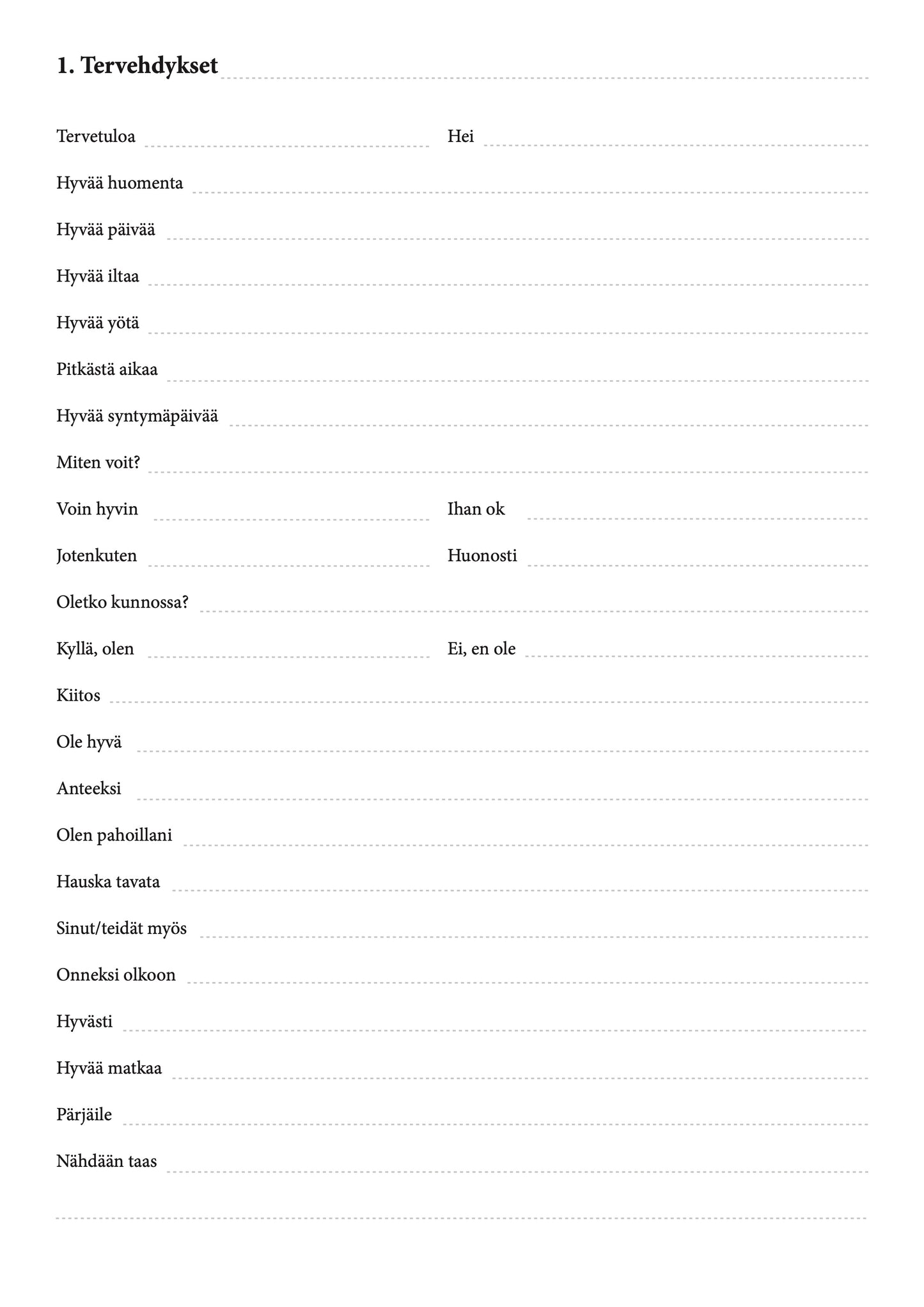 Tätä kirjaa on hyvä myös käyttää apuna puhumisharjoituksia tehdessä. Voit täyttää yhden aihepiirin sanalistat ja tyhjän sivun ja treenata kielikaverisi kanssa kyseisen aiheen sanastoa kunnes osaat sujuvasti puhua siitä.