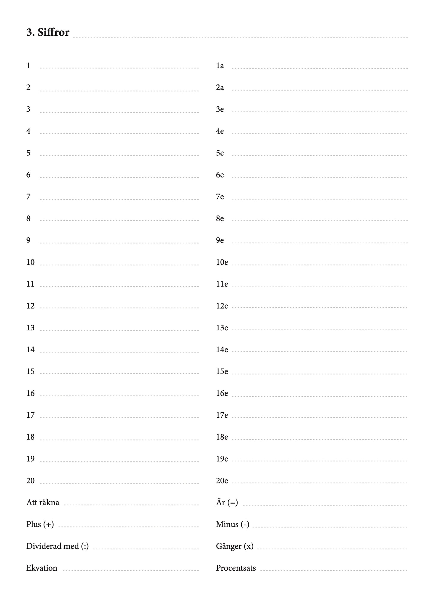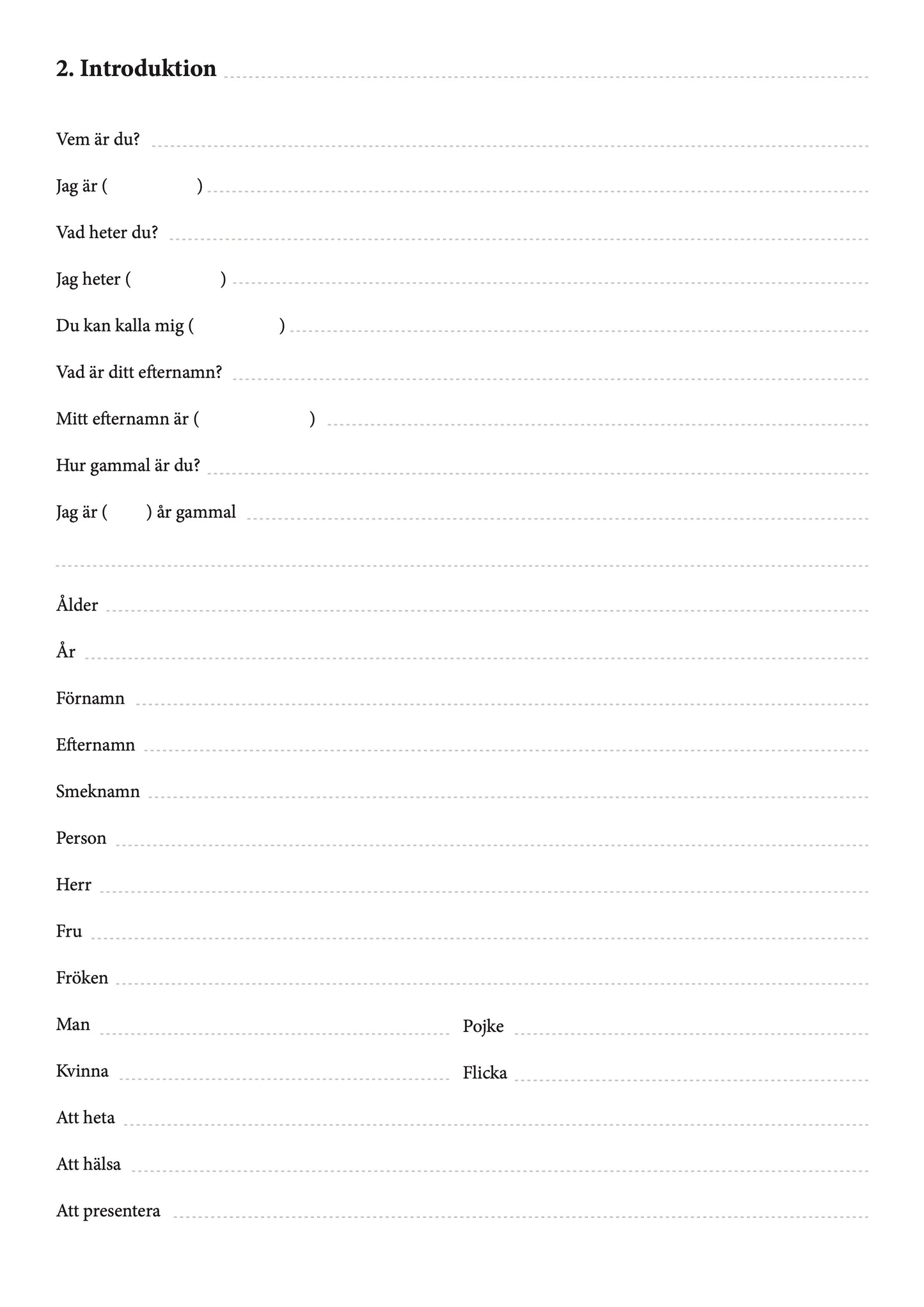 - Vänstersida (ordlistor och tomma utrymmen att fylla i med översättningen)